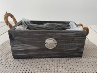 Macetero de madera con un diseño rústico y asas de cuerda. - Acabado en tonos grises y marrones. - Asas de cuerda para facilitar su transporte. - Interior forrado con plástico.