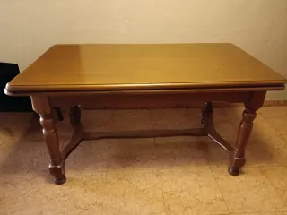 Mesa grande de comedor extensible,de madera maciza 1600 de largo, 850 de ancho y 800 de alto, con dos lados extensibles de 550 cada uno. Medida total: 2700*850*800mm. Mirar ultimas fotos para ver algunos defectos. La mesa es muy grande y el traslado corre a cuenta del comprador. La mesa hay que sacarla por el balcón de una planta baja. - Fabricada en madera maciza. - Extensible para mayor capacidad. - Patas torneadas con un diseño elegante.