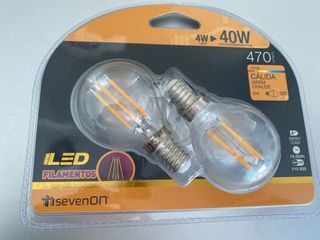 Bombilla LED de filamentos de la marca sevenON. - Potencia: 6W (equivalente a 40W incandescente). - Flujo luminoso: 470 lúmenes. - Temperatura de color: 4000K (Blanca). - Casquillo: E14. - Ángulo de apertura: 120°. - Clase energética: A+. - Vida útil: 15.000 horas.
