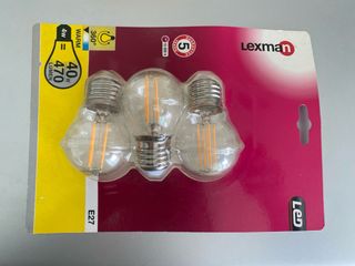 Pack de 3 bombillas LED de la marca Lexman con casquillo E27. Proporcionan una luz cálida y un ángulo de iluminación de 360 grados. - Potencia: 4W - Equivalencia: 40W - Flujo luminoso: 470 lúmenes - Temperatura de color: Cálida - Ángulo de luz: 360° - Duración: 15.000 horas