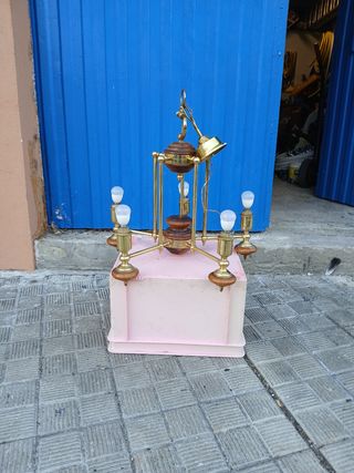 Elegante lámpara colgante con detalles en madera y latón. Perfecta para dar un toque clásico a cualquier estancia. - Diseño de 5 brazos. - Acabados en dorado y madera.