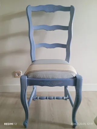 Elegante silla tapizada con un diseño clásico. - Estructura de madera. - Tapicería en tela con rayas beige y azules. - Respaldo curvo con detalles decorativos. - Patas delanteras curvas y traseras rectas.