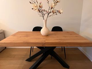 Mesa de comedor con un diseño moderno y funcional. Su superficie imita la veta de la madera, aportando calidez al espacio. Medidas 160x90 y extendida 240x90 Fotos 3,4,5 y 6 con los dos tableros que tiene dentro puestos y fotos 7 y 8 solo con un tablero La mesa abierta se hace muy grande - Patas de metal negro con un diseño robusto. - Tablero con acabado en madera.