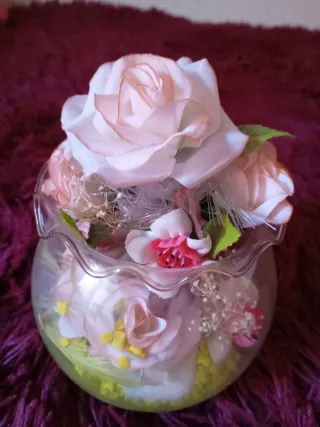 Precioso adorno decorativo con flores. En un jarrón de cristal - Flores de tela en tonos rosas y blancas. - Base de cristal. MUY NUEVO GUARDADO EN VITRINA Se entrega en persona Visita mi página para ver otras ofertas