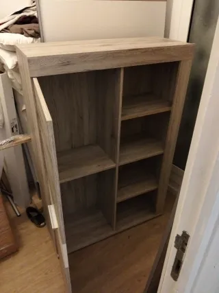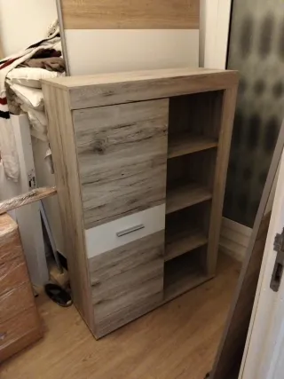 SE RECOGE EN HOSPITALET DE LLOBREGAT Mueble de madera con espacio para equipos electrónicos y almacenamiento. - Puerta de cristal para exhibir dispositivos. - Cajones superiores para guardar objetos. - Diseño robusto y elegante.