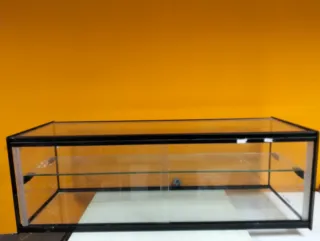 Vitrina expositora con estructura de madera y paneles de cristal. - Diseño moderno y elegante. - Ideal para exhibir objetos. - Fácil de limpiar.