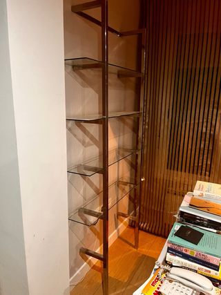 Elegante estantería con estructura metálica y baldas de cristal. - Diseño moderno y minimalista. - Ideal para exhibir productos o decoraciones.