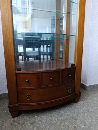 Malaga, zone Haza Cuevas. Elegante vitrina de madera con puertas de cristal y dos cajones inferiores. - Diseño clásico con detalles tallados. - Puertas con divisiones de cristal. - Tiradores metálicos decorativos.