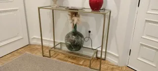 Elegante consola recibidor con estructura dorada y sobre de cristal. - Diseño moderno y funcional. - Combina metal y cristal para un acabado sofisticado.