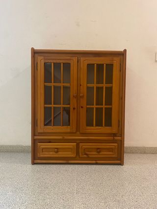 Mueble vitrina de pino macizo para colgar en pared. Tiene dos puertas de cristal con almacenaje con dos baldas, y dos cajones. Se puede combinar con otros muebles que vendo también. Medidas: ancho 80cm, altura 1,00 m, fondo 32cm. Para recoger en Sevilla