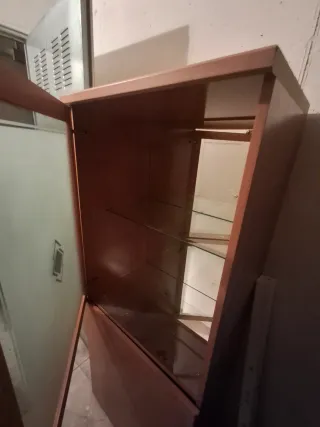 Mueble de madera con vitrina para almacenar y exhibir objetos. - Puertas de cristal. - Estantes interiores. Cajoneras parte inferior y puertas La parte de arriba y la de abajo se separan VENIR A RECOGER, NO SE ENVIA, SE DESMONTA.SE VENDE SIN LA CRISTALERIA.