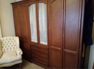 Armario de madera de fresno macizo. 6 puertas (2 vitrina) y 4 cajones. Muy buen estado, actualmente en uso. Medidas: 222x253x56 cm (AlxAnxFon). Gran capacidad y diseño clásico elegante. Madera noble de calidad. #armario #mueble #madera #roble #armariomadera