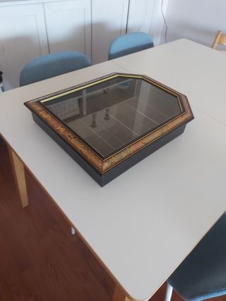 Vitrina de madera y cristal. De altísima calidad. Acabados excelentes. Interior forrado en terciopelo, incluso el marco. Robusta y elegante. Ideal para pequeñas figuras o miniaturas. Medidas 52x42x10