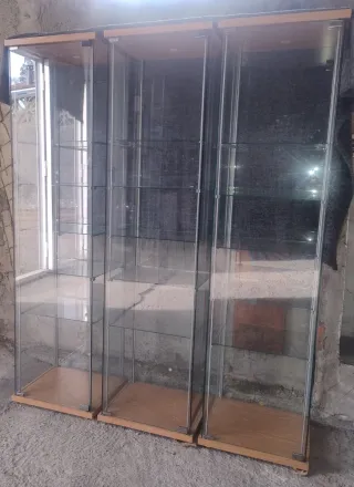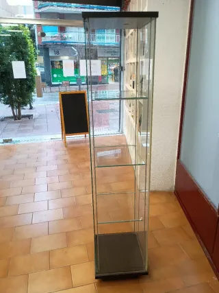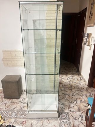 VENTA EXCLUSIVAMENTE EN PERSONA. Vitrina expositora de la marca IKEA en perfectísimo estado. Perfecta para colecciones. Se entrega montada. Si el comprador quiere retirar las baldas es a cuenta propia (están sueltas pero requerirían embalaje adecuado). - Estructura de metal resistente. - Puertas de cristal para una visualización clara con cierre de llave (vienen dos unidades). - Estantes de cristal ajustables en altura. - Resisten peso las baldas.
