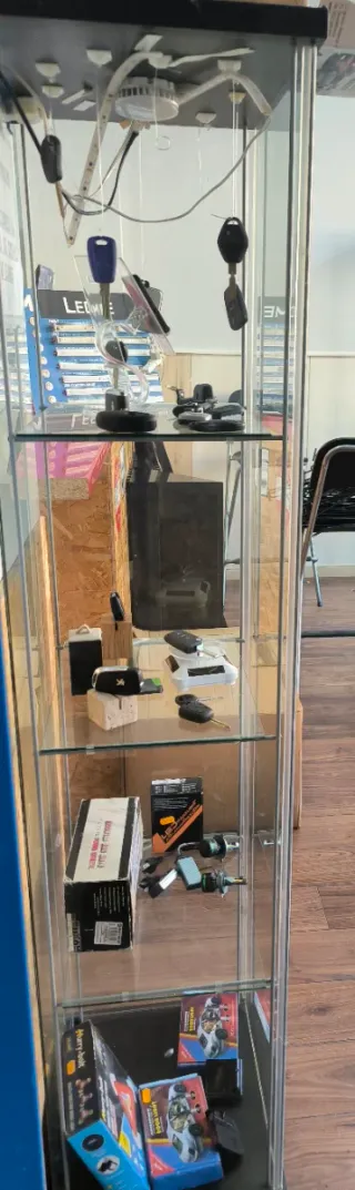 Vitrina expositora de Lidl, ideal para exhibir colecciones o productos. - Estructura de madera. - Puertas y estantes de cristal. Incluye 9 estantes de cristal. - Dimensiones (centímetros): 90 alto, 59 ancho, 18 de fondo. Solo venta en persona en Arganda del Rey