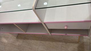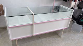 Vitrina expositora con un diseño moderno y elegante. Medidas: Ancho 49cm Largo 150 cm Alto 87 cm - Estructura principal en color blanco. - Detalles decorativos en color rosa. - Superficie superior de cristal. - Compartimentos de almacenamiento. - Un cajón con tirador.