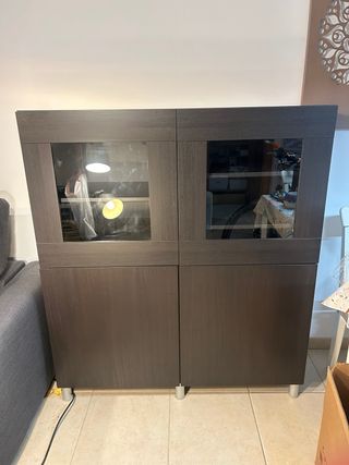 Mueble de televisión de Ikea combinaciones BESTA, precio negociable. - Combina madera y cristal. - Acabado en negro/marrón. - SUELO: Tres módulos de suelo con patas de 10cm altura. 2 módulos de largo x alto x fondo 120x38x42cm con puerta (estantería intermedia) y cajón 1 módulo central de 60x38x42cm. - PARED COLGADO: Un módulo colgado tipo vitrina con las puertas de vidrio de largo x alto x fondo 120x38x42cm. - Los módulos de suelo tienen algún defecto menor que se ve en fotos del uso, el módulo colgado está intacto. - El precio es por el conjunto, también lo vendería por módulos y el precio sería a convenir.