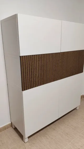 conjunto modular IKEA BESTÅ en perfecto estado. Es una combinación personalizada que mezcla acabados en madera clara, blanco y frentes decorativos botánicos. Muy estético, funcional y con muchísima capacidad de almacenaje. Desglose de medidas y módulos: • Módulo Izquierdo (40 x 30x 200 cm): Estantería alta con frente de diseño de hojas (Edición especial). • Zona Central (240 cm total): Dos muebles bajos de 120 x 40 x 50 cm incluyendo patas cada uno. Incluye vitrina central con 3 baldas de cristal y muebles superiores a juego de 120 cm. • Armario Derecho (120 cm): Módulo de gran capacidad con puertas bicolores blanco/madera.