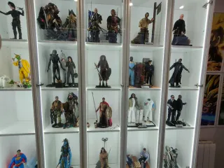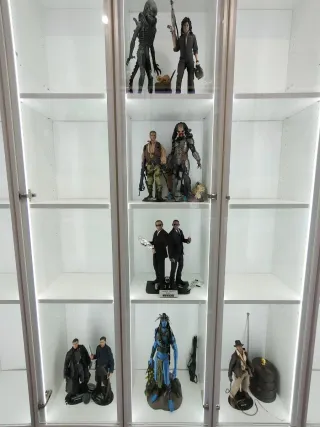 Conjunto de vitrinas expositoras perfectas para coleccionistas. Cuentan con iluminación integrada para destacar tus piezas. 200cm de ancho x 237 de alto. Llevan puertas de cristal y de madera en la parte inferior. Las estructuras son Billy de Ikea, las puertas de cristal Hogbo y las de madera Oxberg Dos tiras de led COB de 24v en cada módulo de arriba a abajo con perfil metálico en esquina y cubierta. Fuente de alimentación para los led y potenciómetro. Están en Hospitalet de Llobregat. Costó todo 850€ Lógicamente las figuras Hot Toys no están incluidas. - Diseño moderno y elegante. - Iluminación LED. - Múltiples estantes.