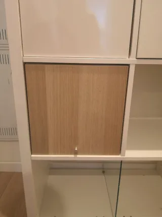 Mueble de recibidor con un diseño moderno y funcional. KALLAX - Estructura principal en madera. - Accesorio: Paneles frontales en blanco. Incluidos. Posible quitarlos y cambiarlos por otras opciones de IKEA (cajones, etc.) - Patas incluidas