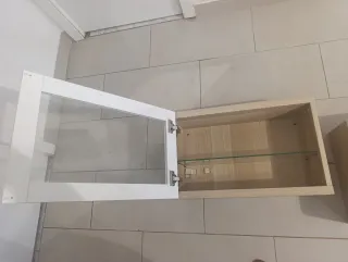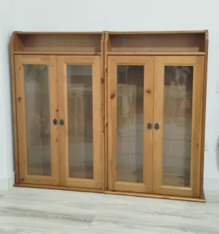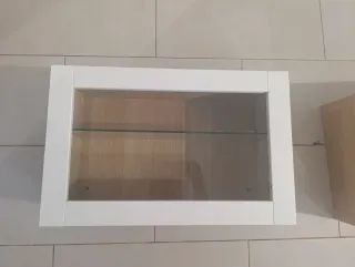 Vitrina de la marca Ikea con puertas de cristal y estructura de madera. Hay una balda con la pintura picada Recogida el viernes por la tarde. Hay q bajar andando 8 pisos pues no cabe en ascensor
