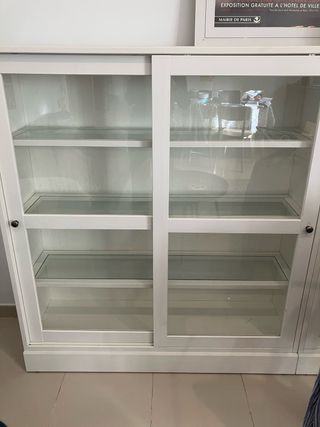 Mueble de almacenaje de Ikea con puertas de cristal. - Estantería con varios compartimentos cajones y armario con baldas. - Puertas de cristal para exhibir objetos. - Diseño de madera. - Color crema / blanco - Se venden juntas o separadas cada módulo mide 90cm de ancho Preguntar sin compromiso, buen estado.