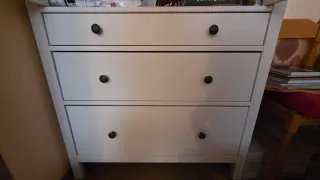 Cómoda de cinco cajones de IKEA, modelo KOPPANG. Su diseño sencillo y funcional se adapta a cualquier habitación. 90x44x114 - Cinco cajones amplios para almacenamiento. - Tiradores negros redondos. La bandeja de arriba tiene algunas zonas un poco dañadas (ver segunda y tercera foto)