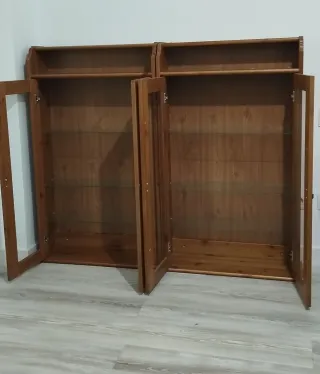 Conjunto de dos vitrinas de madera de la serie Leksvik de Ikea. Perfectas para exhibir objetos o almacenar vajilla. - Tres estantes de cristal interiores - Diseño clásico con puertas de cristal. - Acabado en madera natural. - Entrega en mano