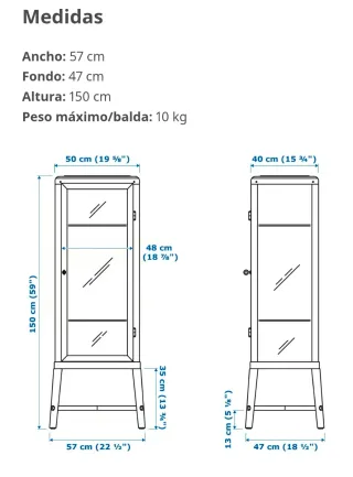 Medidas: 163x43x37 cm. Características: 4 niveles de exposición, puerta con cierre magnético. Se entrega montada. Es necesario venir a recogerla con un vehículo adecuado (coche amplio o furgoneta) debido a la fragilidad y tamaño del cristal.