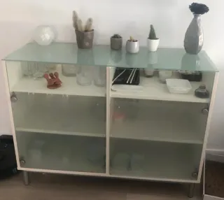 Vitrina de Ikea en buen estado, con puertas correderas de cristal. Sin tiradores. - Diseño moderno y funcional. - Amplio espacio de almacenamiento. - Ideal para exhibir vajilla o decoraciones. - Recogida en la vivienda. Los gastos de transporte los asume el comprador.