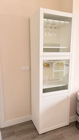 Vitrina Besta en perfecto estado, como nueva. Combina madera y cristal para un diseño elegante. - Estructura de madera. - Puerta de cristal. - Acabado en blanco y madera.