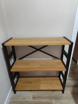 Estantería de diseño industrial con una combinación de materiales que le da un toque moderno. Precio en tienda 89'99€. - Estructura combinada en color madera y negro. - Baldas de madera en tono natural. - Nueva, solo utilizada de exposición. Armario, mueble, almacenaje, decoración, vitrina, Ikea, maison du monde, banak importa, Conforama, zara home, diseño, alacena, cajonera, retro, vintage, roble, madera natural, pino, comedor, despacho, habitación, oficina, salón.
