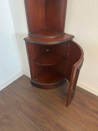Mueble rinconera con madera de gran calidad hecha por un ebanista, con tres baldas en la parte superior y puerta en la inferior. Muy versatil y apta para diferentes espacios del hogar.