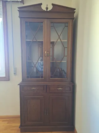 Elegante mueble de caoba con vitrinas y compartimentos de almacenamiento. - Diseño clásico con detalles tallados. - Puertas de cristal para exhibir objetos. - Amplio espacio interior.Se incluyen mesa extensible de 3 metros y seis sillas