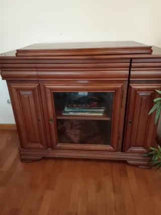 Mueble auxiliar de madera maciza de castaño con compartimentos y una vitrina para TV con base superior de plataforma de madera movible al gusto de la visibilidad de la televisión. - Diseño clásico y elegante. - Puerta con cristal para exhibir objetos. - Compartimentos interiores para almacenamiento frontales y laterales ,apertura total de piezas laterales de la mesa para de almacenaje como vinecoteca u otros enseres. -📌 Retirada de la venta en la plataforma de segunda mano el lunes 🎈🏠🪑🛏️🛋️🪵🎁