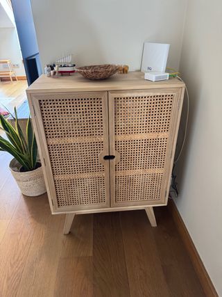 Mueble marca Sklum aparador de diseño moderno con acabados en madera y ratán. - Puerta con detalle de ratán. - Patas de madera cónicas. - Cajones con tiradores de madera.