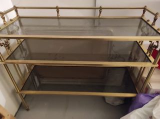 Elegante mueble recibidor con estructura metálica y detalles dorados. - Superficies de cristal. - Diseño moderno y funcional.