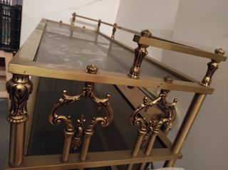 Elegantes mueble y espejo recibidor con estructura de bronce y detalles en cristal. - Diseño de dos niveles. - Acabado dorado brillante. - Patas con detalles ornamentales. -Sólo venta en persona Medidas Mueble: Ancho :91 cm Alto:71 cm Fondo :35cm Espejo Alto: 97 cm Ancho: 57 cm Fondo: 2 cm