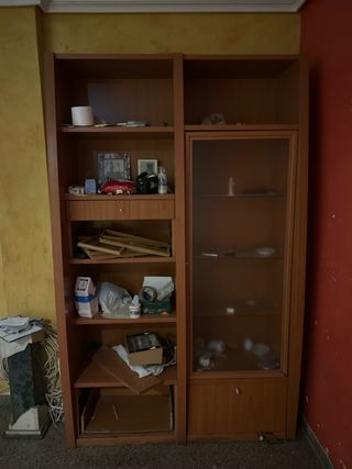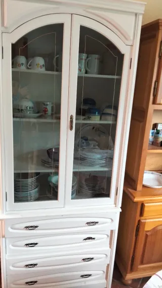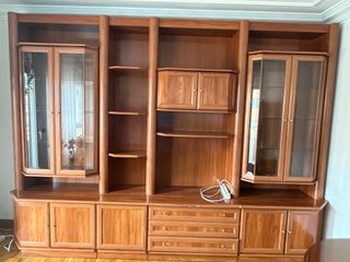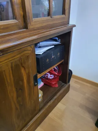 Vendo vitrina–aparador de madera maciza, robusta y de estilo clásico, ideal para salón o comedor. Mueble muy amplio y funcional, con gran capacidad de almacenaje: vitrinas con cristal para vajilla o decoración, varios armarios cerrados, cajones centrales y estanterías abiertas. Está en buen estado general, bien cuidada, con herrajes originales y un acabado en madera natural muy elegante. Perfecta para guardar copas, platos, libros o cualquier objeto decorativo, aportando un toque clásico y acogedor al hogar. Mueble sólido y duradero, de los de antes. Ideal para quien busca calidad, espacio y estilo.