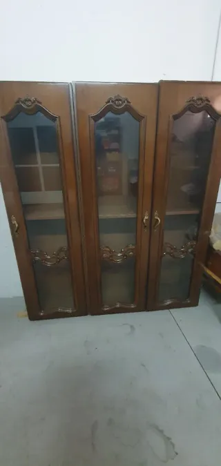 Elegante mueble vitrina de salón con un diseño clásico. Ideal para exhibir tus objetos decorativos o vajilla. - Estructura principal de madera. - Puertas con paneles de cristal. - Tiradores dorados. - Detalles ornamentales en la parte superior e inferior de las puertas. Se pueden vender por separado 3 vitrinas 55 euros 2 vitrinas 30 euros 1 vitrina 20 euros Pago en efevtivo. No hago envios