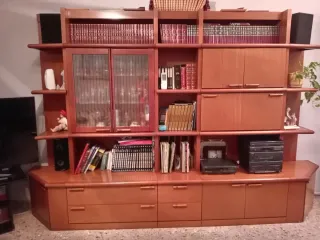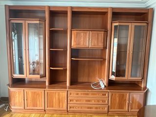 Preciosa boaserie de madera de cerezo, ideal para tu salón. Se encuentra en muy buen estado. - Mueble de salón completo con vitrina. - Incluye espacio para TV y almacenamiento. - Diseño elegante en madera de cerezo.