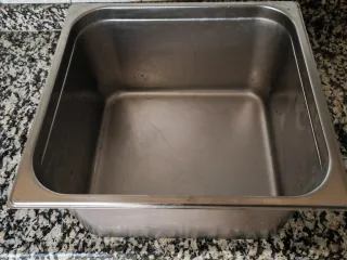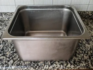 Bandeja de acero inoxidable, ideal para vitrinas o expositores. - Material: Acero inoxidable. - Diseño rectangular con bordes redondeados. Con tapa