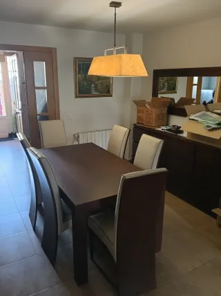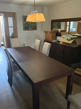 Conjunto de mesa de comedor con seis sillas a juego. El diseño moderno y elegante aportará un toque especial a tu hogar. - Mesa de madera oscura. - Sillas con asientos y respaldos tapizados en piel. - Estructura de las sillas en madera oscura. - aparador a juego de gran capacidad -Vitrina a juego -Mesa de centro a juego -Mueble de televisión a juego Se adjunta factura de compra.