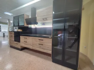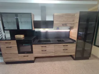 Conjunto de cocina de exposición con un diseño moderno y elegante. - Muebles con acabados en madera. - Encimera y detalles en negro. - Vitrinas de cristal.