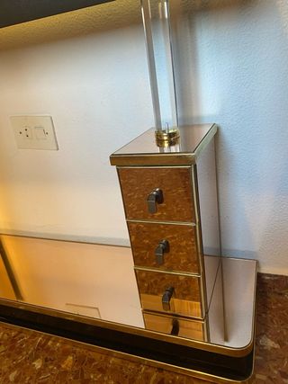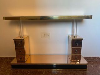 Mueble recibidor dorado y espejo.