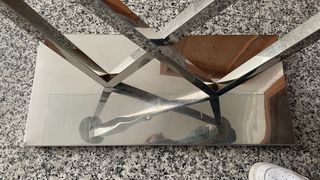 Elegante mueble de entrada con un diseño contemporáneo. - Base rectangular de metal pulido. - Estructura geométrica de metal. - Superficies de cristal.
