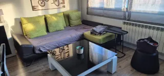 Conjunto de muebles para salón de diseño. - Sofá modular con cojines. - Mesa de centro con superficie de cristal. - Mesa grande con 6 sillas. - Mesa auxiliar. - Puf. - Aparador. - Vitrina con cajón y armarios. - Mueble pared encima del anterior.