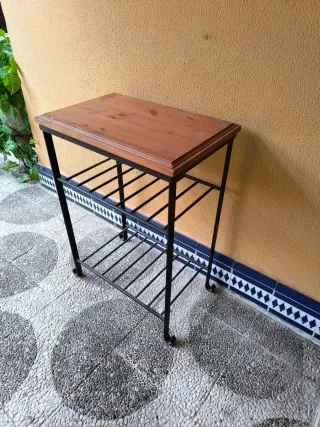 Práctico y decorativo mueble auxiliar ideal como recibidor, mesita de teléfono, o mesa de noche. Estructura de hierro forjado o metal negro robusto y duradero, combinado con una tapa superior de madera en tono natural/nogal Dispone de dos estantes inferiores de rejilla metálica para almacenamiento (revistas, libros, cestas, zapatos o decoración). Perfecto para espacios reducidos gracias a su formato compacto y vertical Buen estado general, con la pátina y el carácter que le dan los años al metal y a la madera. La superficie de madera puede presentar ligeras marcas de uso, fáciles de restaurar o lijar si se desea