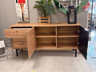 Elegante aparador con un diseño moderno que combina la calidez de la madera con el contraste del negro. - Patas metálicas resistentes. - Acabado en madera natural. - Panel frontal en color negro. - Envio a contrareembolso - Nuevo de paquete