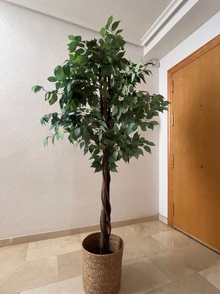 Hermoso combo para recibidor con un diseño moderno y funcional. - Acabado en madera clara. - Puertas con detalle de ratán. - Patas metálicas negras. -espejo redondo grande en marco de acero -planta artificial con efecto realista